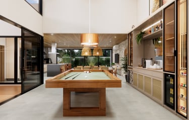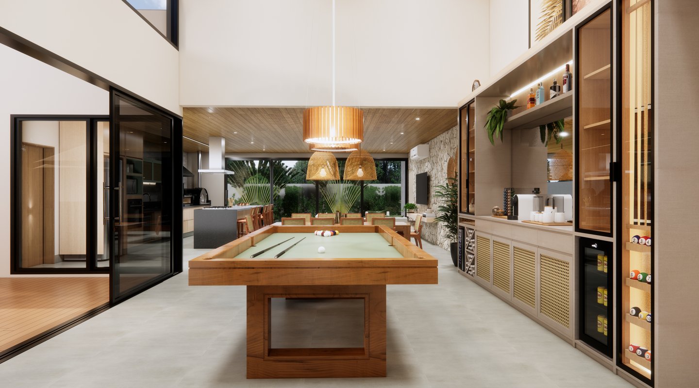 Ao lado da sala, uma mesa de bilhar se integra perfeitamente ao espaço, acompanhada de uma cristaleira que não só guarda louças, mas também serve como um bar, com uma parte dedicada ao armazenamento dos tacos e equipamentos de bilhar.