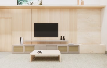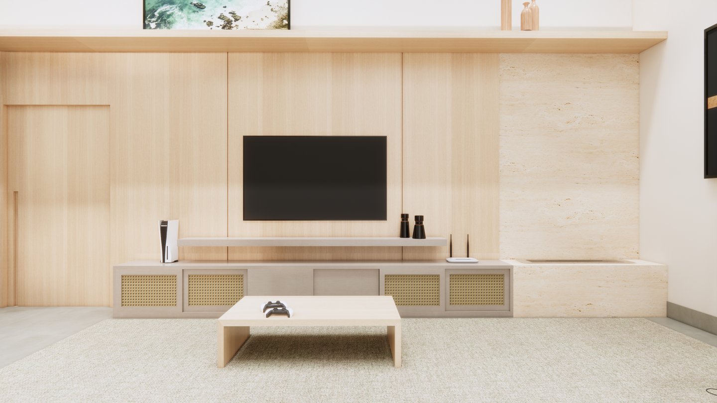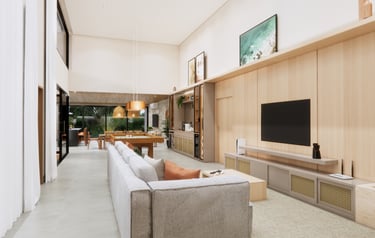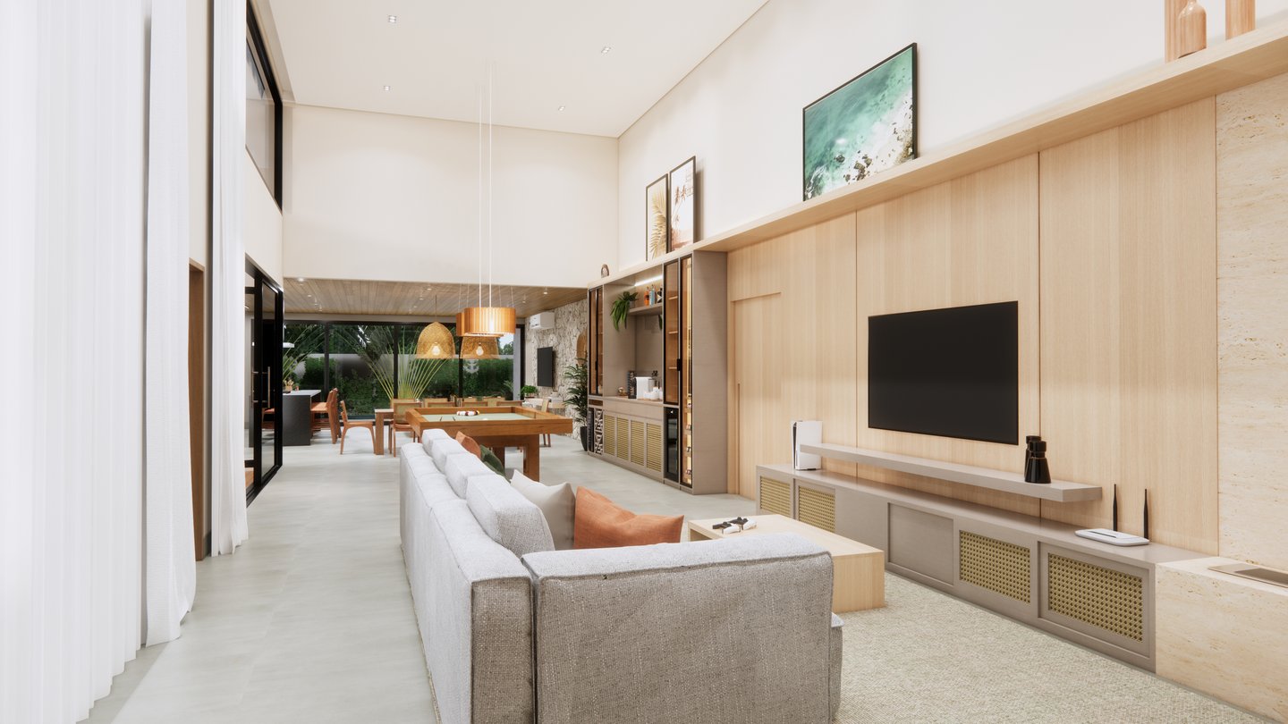 Neste projeto de interiores, a sala de estar com pé direito alto foi valorizada por um painel de TV que se estende por toda a parede, ocultando discretamente a porta do corredor através de uma porta oculta. A paleta de cores escolhida para o ambiente traz leveza e sofisticação, criando uma atmosfera acolhedora e elegante.