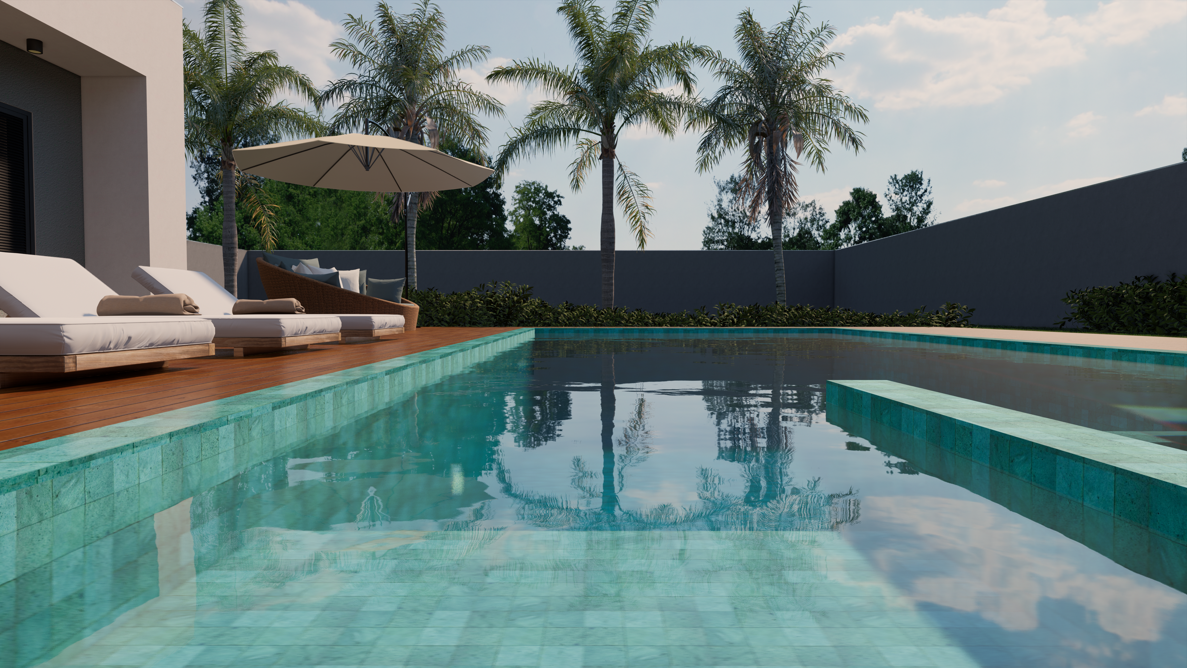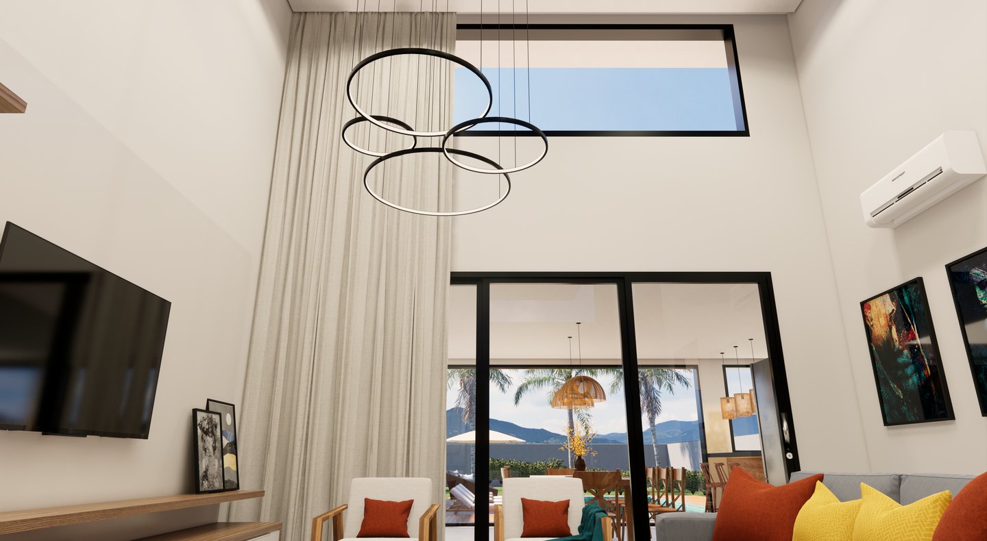 O pé direito duplo na sala de estar amplia a sensação de espaço, enquanto as portas de vidro do espaço gourmet integram perfeitamente o ambiente com a área externa da piscina, promovendo uma continuidade entre o interior e o exterior.