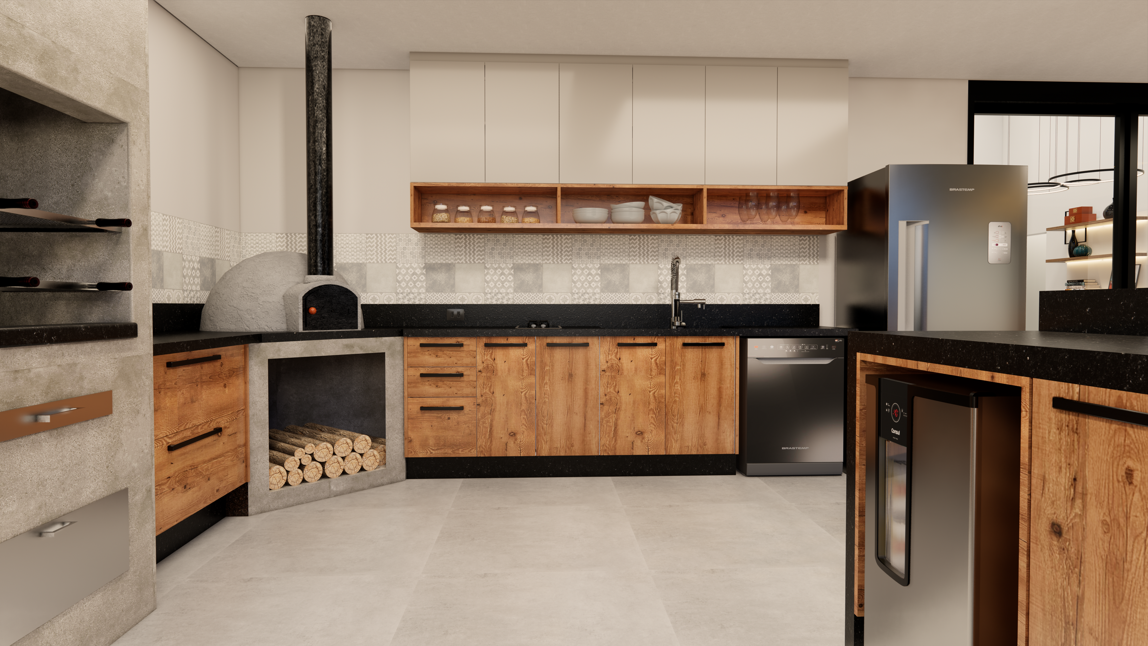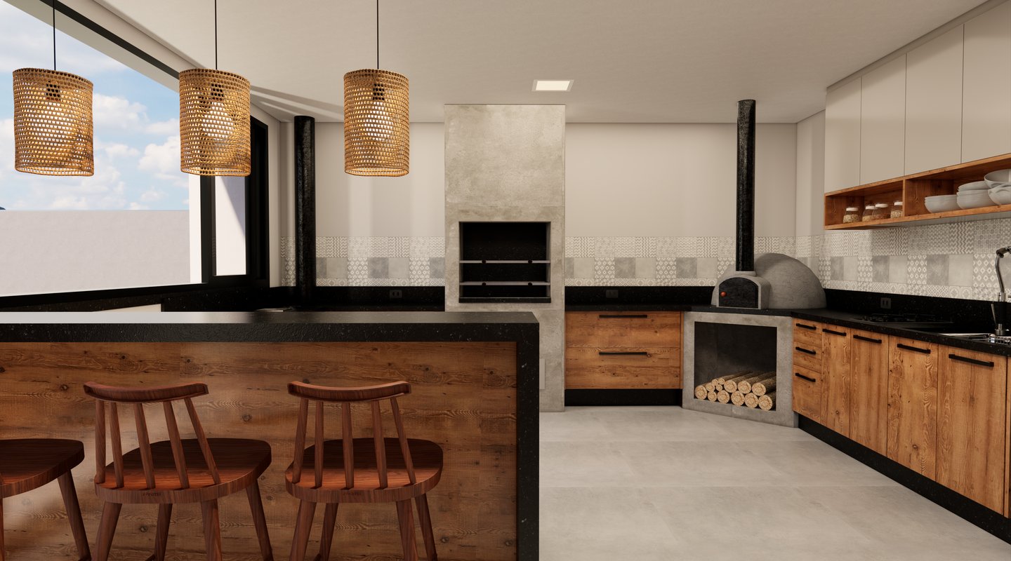 O espaço gourmet é um dos destaques da residência, com uma ampla área integrada, portas de vidro que facilitam a conexão com a área da piscina e um design rústico, que inclui pendentes de fibra natural e móveis em madeira com os veios mais marcados. Equipado com churrasqueira, fogão a lenha e forno de pizza, o espaço gourmet foi pensado para proporcionar momentos de lazer e confraternização.