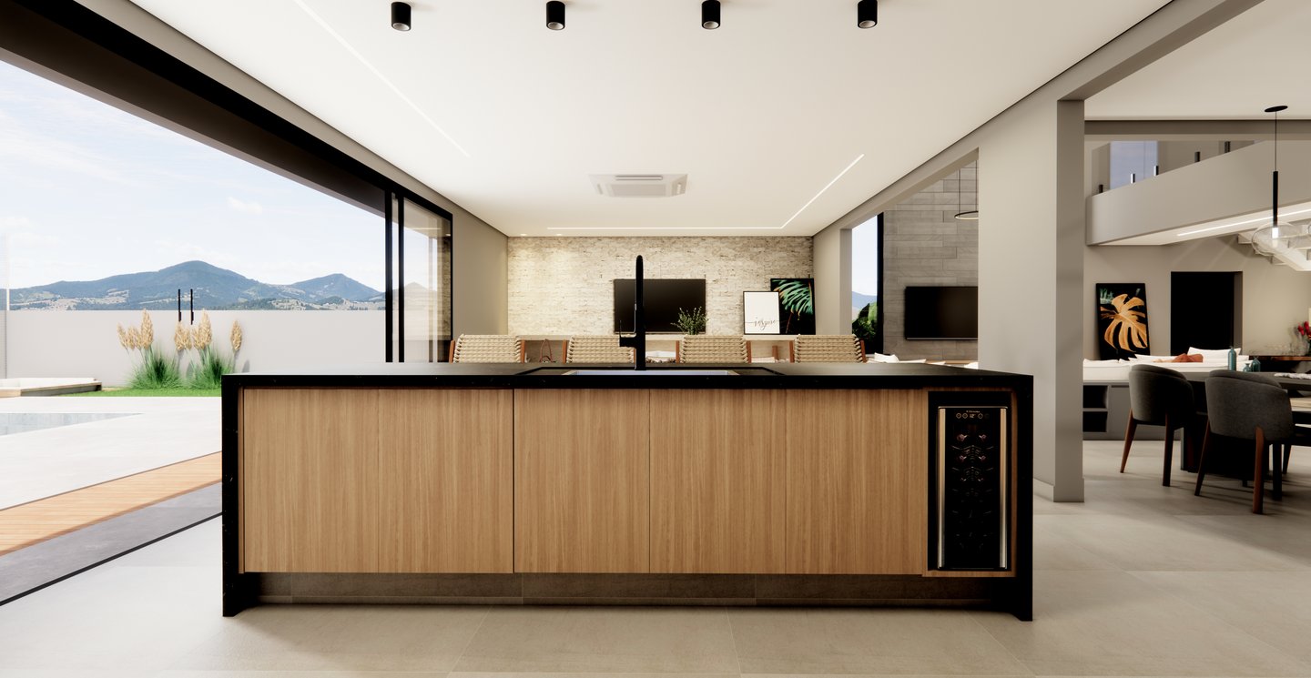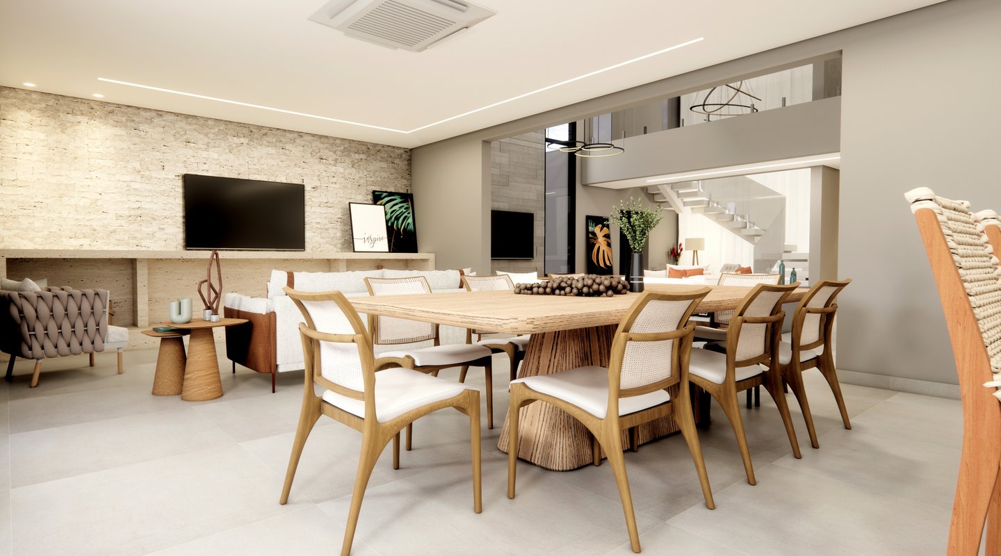 O espaço gourmet é um ponto alto do projeto, totalmente integrado ao living, que conta com TV e lareira em travertino. A área dispõe de uma ampla mesa de jantar para oito lugares, além de uma bancada equipada com forno de pizza, churrasqueira e cuba dupla, com espaço adicional para quatro banquetas na ilha.