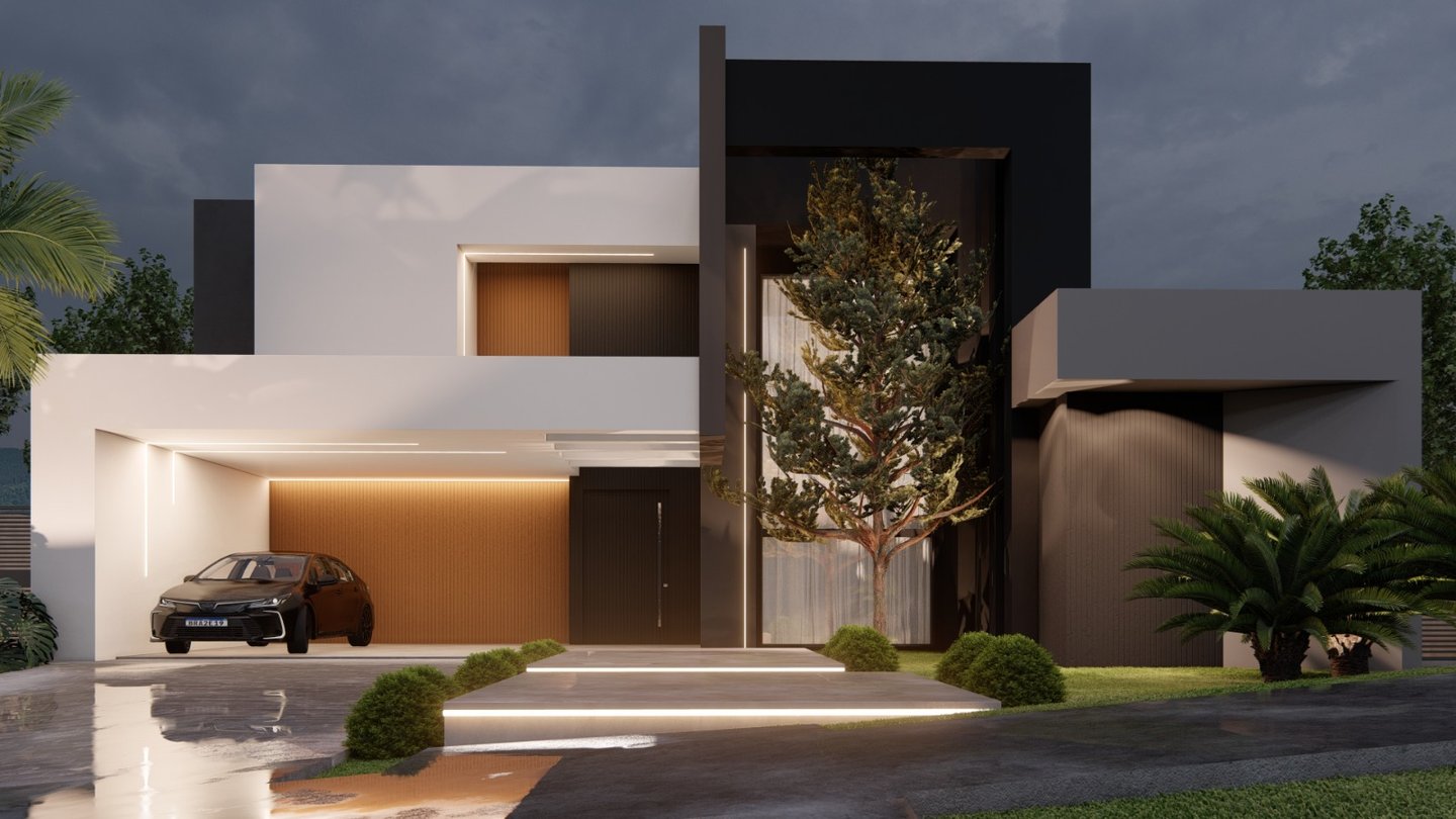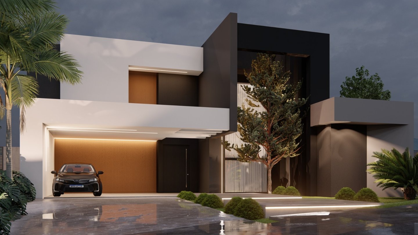 A Residência Wolmer, localizada no Condomínio Portal dos Lagos, em Boituva-SP, foi projetada para unir elegância, funcionalidade e conexão com a natureza. Com 341,73m² de área construída, este sobrado imponente se destaca pela volumetria marcante e pelo uso de materiais contrastantes, como o ripado amadeirado e o ripado preto, criando uma fachada sofisticada. O grande diferencial do projeto é a preservação do pinheiro existente no lote, um pedido especial do cliente, que se tornou um elemento central na composição arquitetônica.