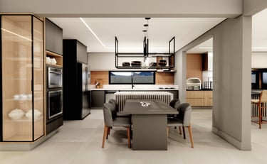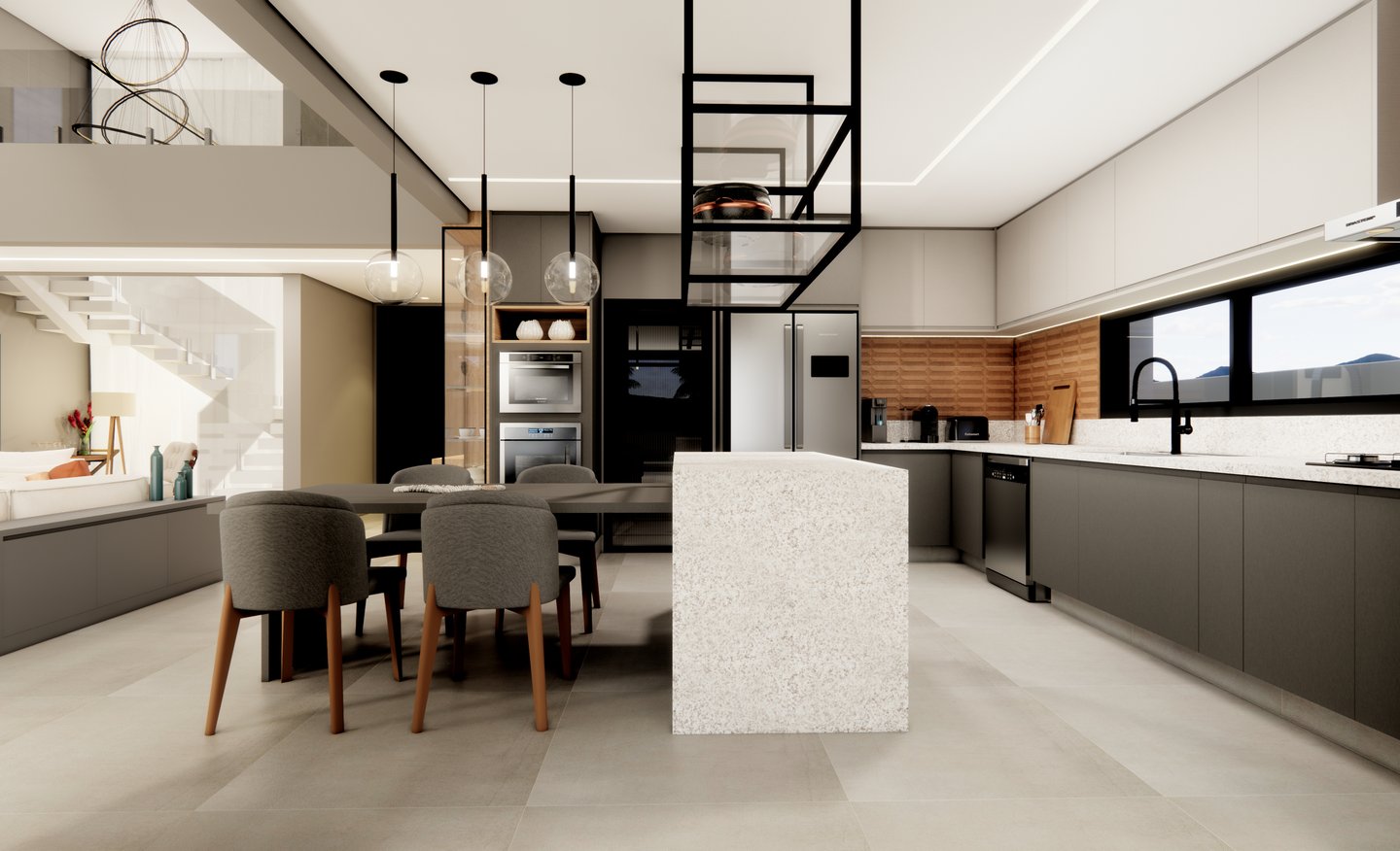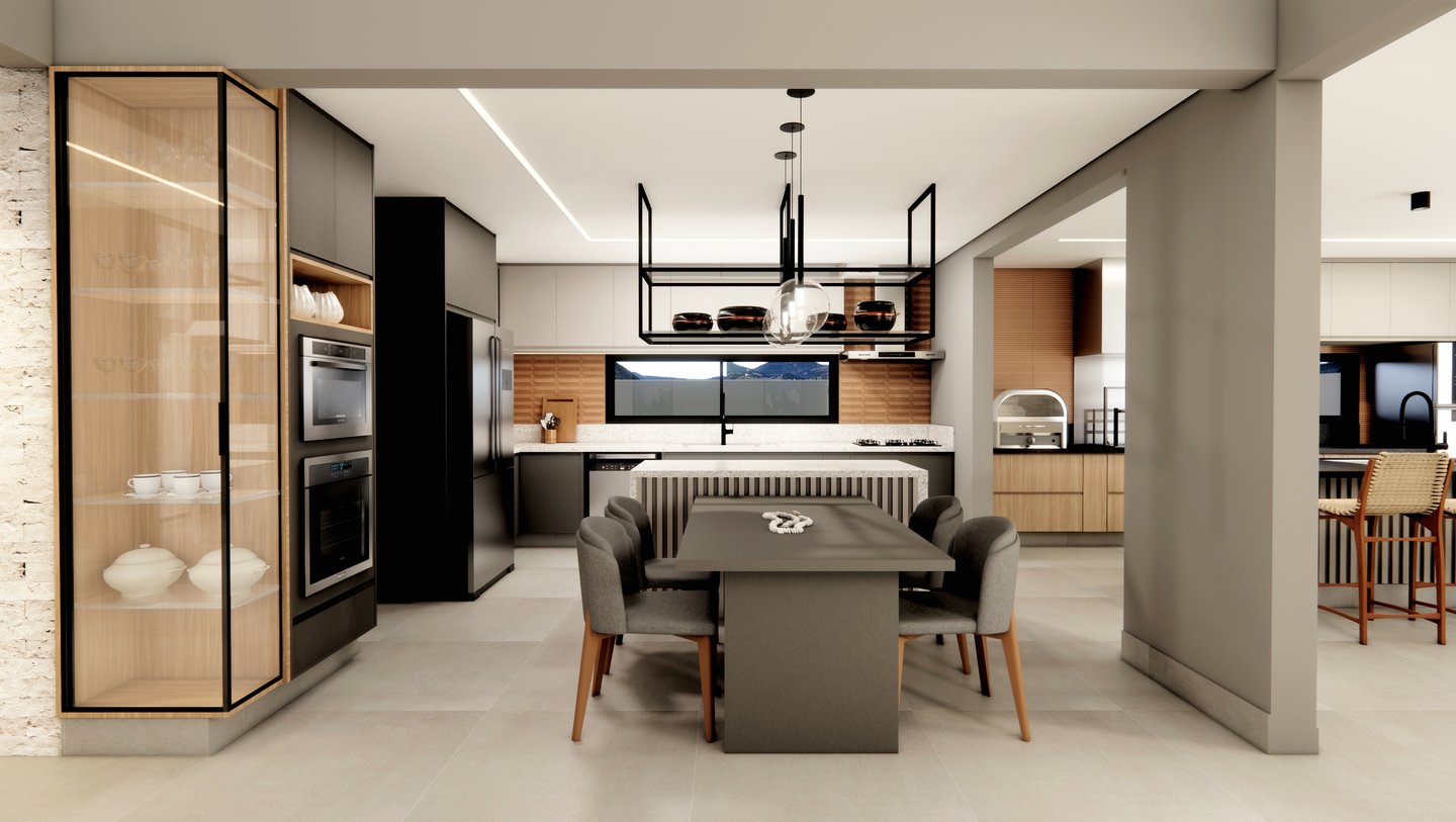 A cozinha integrada traz um design moderno, com móveis cinza em diferentes tonalidades e iluminação embutida na bancada. Um dos destaques é a cristaleira de vidro lateral, visível tanto da sala quanto da cozinha, agregando sofisticação ao ambiente. A ilha abriga uma mesa de jantar para quatro lugares, e um móvel suspenso com prateleiras complementa a funcionalidade do espaço.